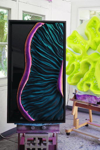In his words, his works aren’t “just paintings.” They’re abstract relief sculptures — textured surfaces layered with depth, ridges, valleys, and organic formations that seem to breathe with light.